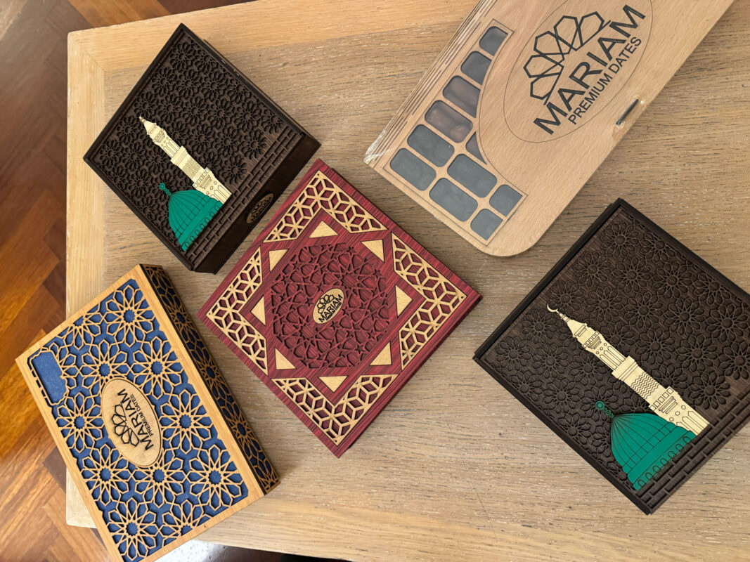 Incisi con motivi ispirati all’arte islamica e realizzati in legno naturale, custodiscono una selezione dei nostri datteri premium Mariam Dates.